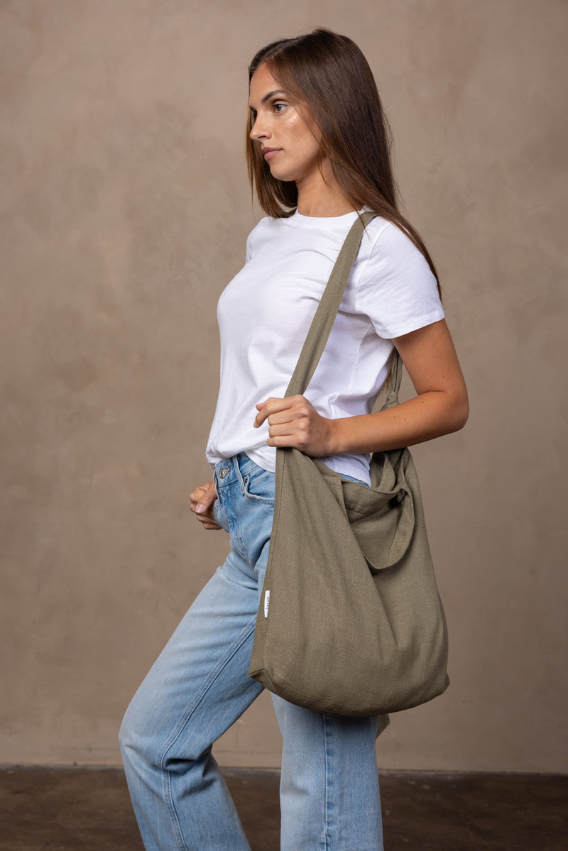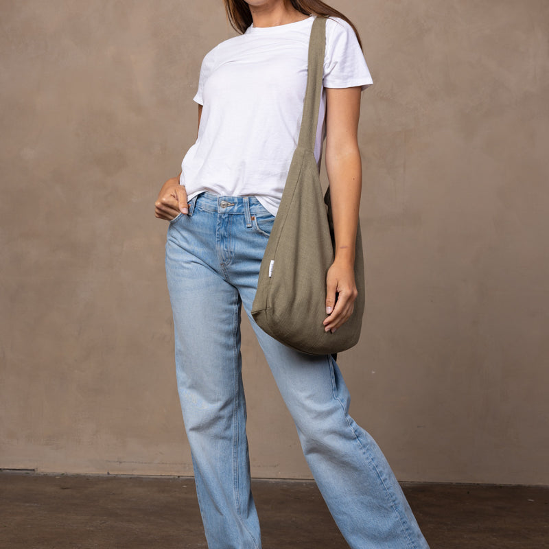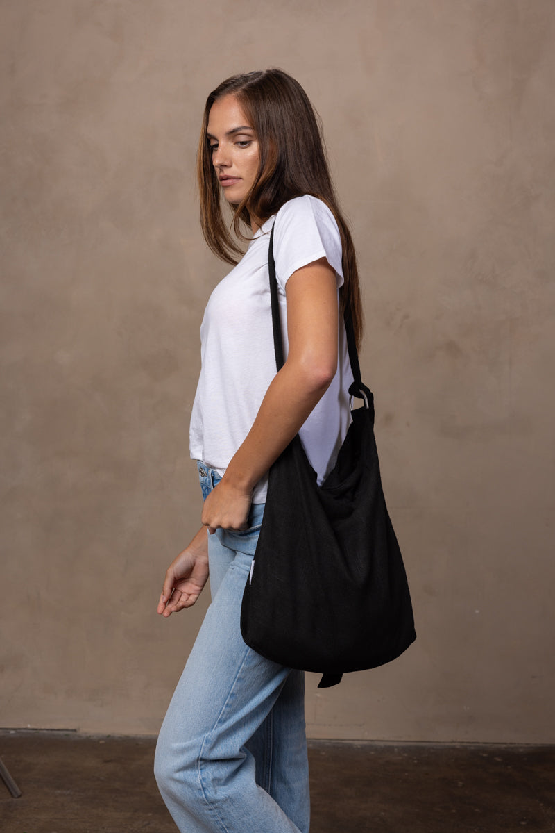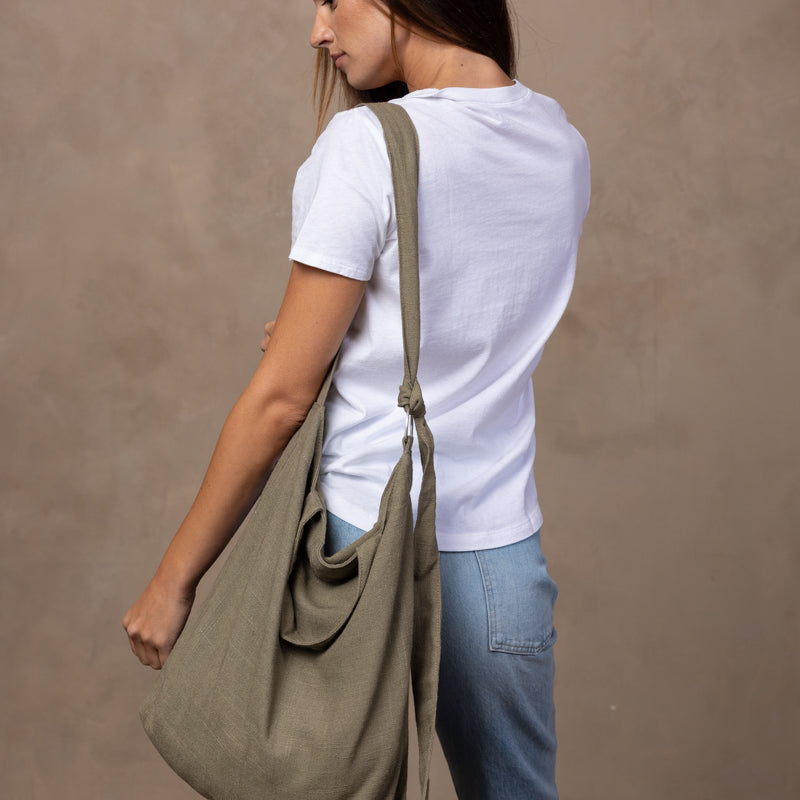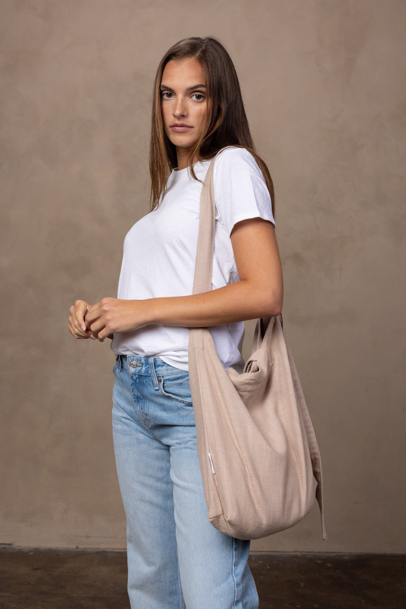 This linen-infused shoulder bag embodies understated luxury. The medium-weight, sweat-absorbent fabric offers comfort and durability, while a bio-washed finish adds softness.