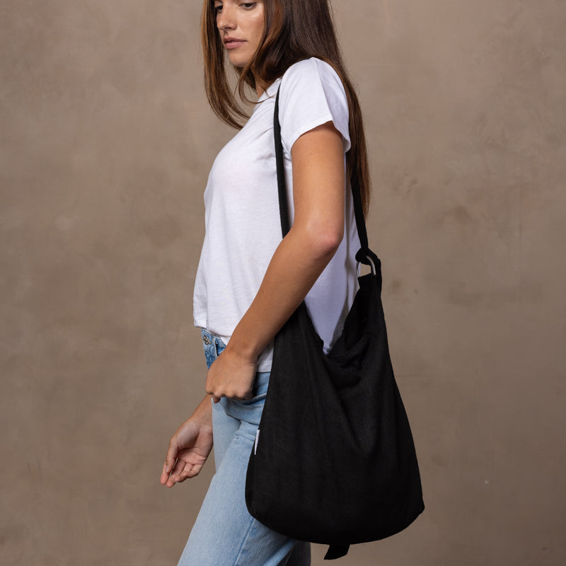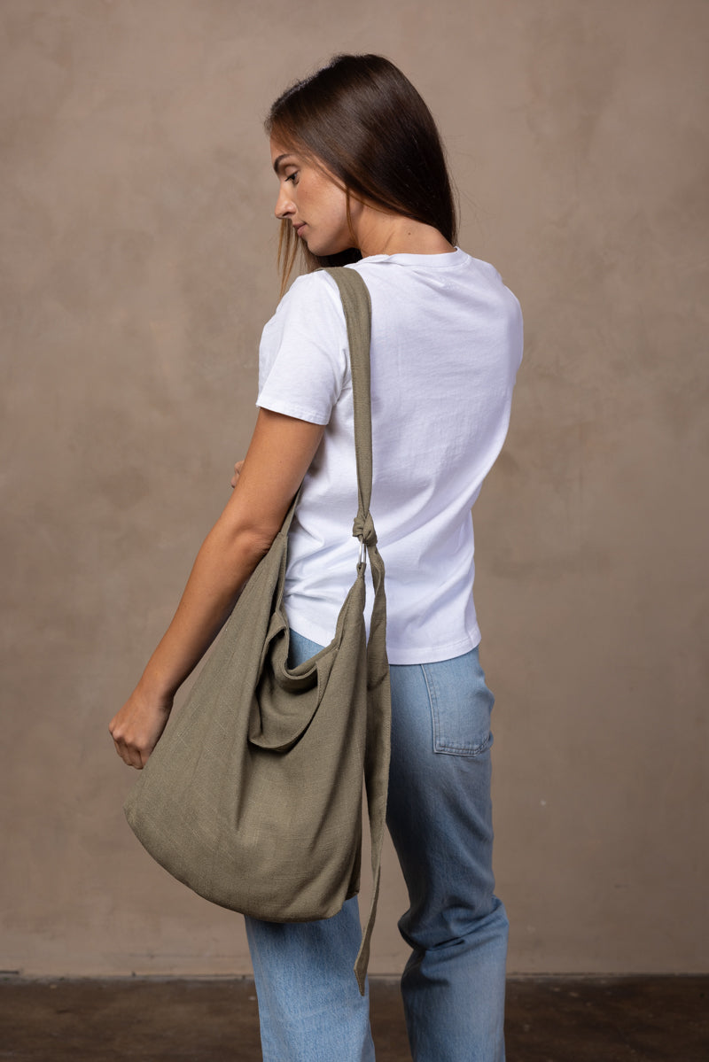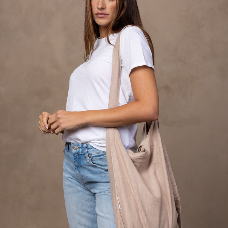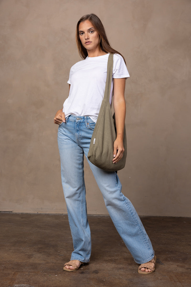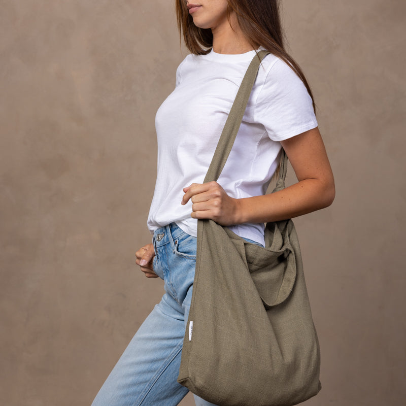 This linen-infused shoulder bag embodies understated luxury. The medium-weight, sweat-absorbent fabric offers comfort and durability, while a bio-washed finish adds softness.